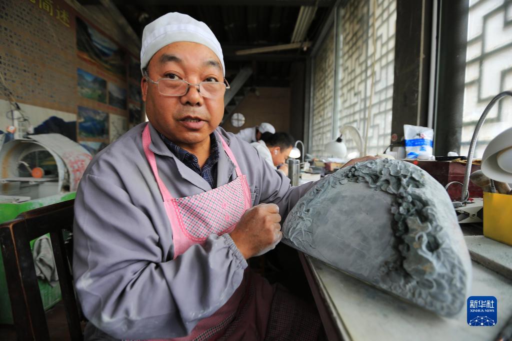 10月24日,藝人在甘肅省定西市臨洮縣洮硯藝術(shù)館介紹一款洮硯的創(chuàng )作構想。