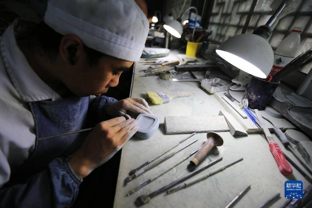10月24日,藝人在甘肅省定西市臨洮縣洮硯藝術(shù)館雕刻制作洮硯。