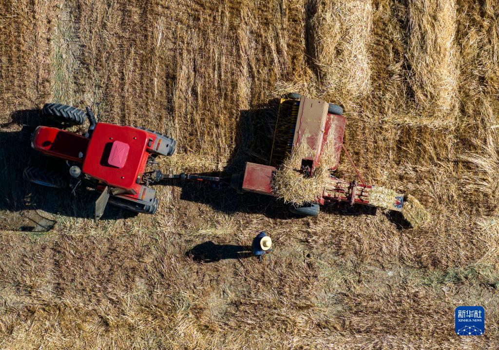 10月24日,村民駕駛農機在拉薩市林周縣強嘎鄉曲嘎強村將收割過(guò)的牧草打包(無(wú)人機照片)。