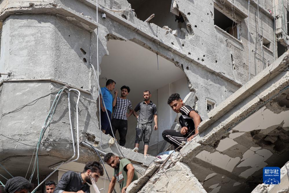 10月24日,在加沙地帶南部城市汗尤尼斯,人們站在遭以色列襲擊的建筑廢墟上。