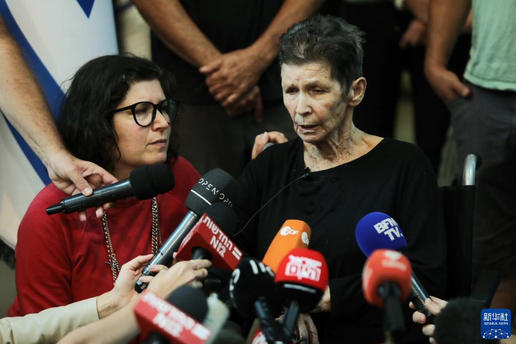 10月24日,獲釋的以色列被扣押人員約赫韋德· 利夫希茨(右)在以色列特拉維夫接受采訪(fǎng)。