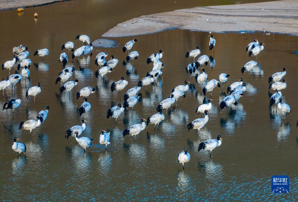 這是在拉薩市林周縣虎頭山水庫拍攝的越冬黑頸鶴(10月24日攝,無(wú)人機照片)。