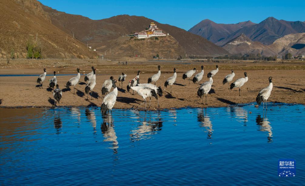 這是在拉薩市林周縣虎頭山水庫拍攝的越冬黑頸鶴(10月24日攝,無(wú)人機照片)。