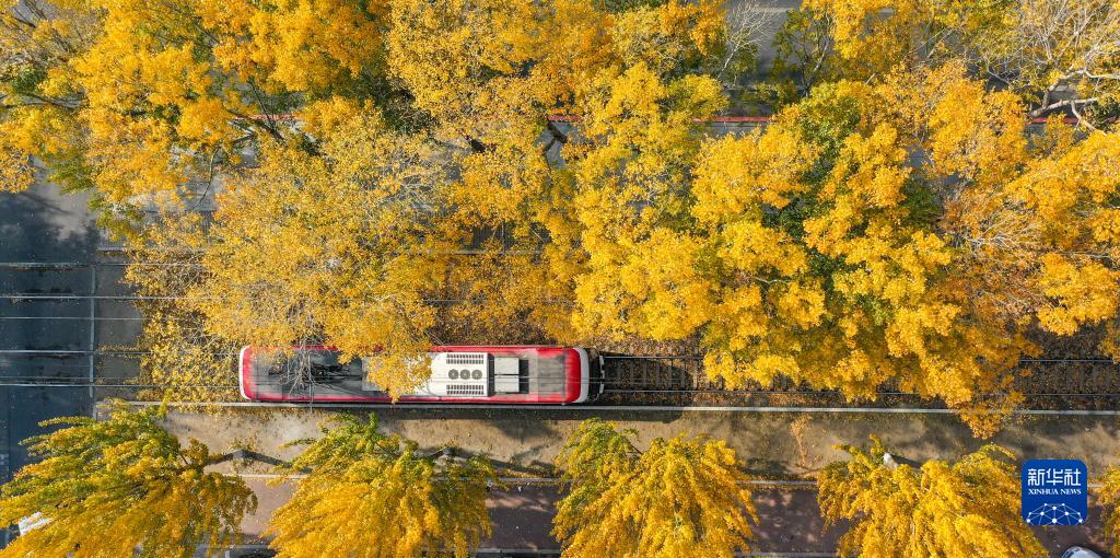 10月24日,一輛電車(chē)行駛在長(cháng)春市春城大街(無(wú)人機照片)。