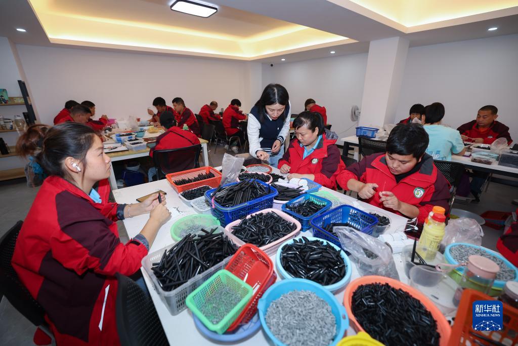 10月25日,黨員志愿者在杭州市臨安區玲瓏街道玲溪社區黨群服務(wù)中心共富工坊指導工人加工手工藝品。該工坊提供輕強度手工的輔助性就業(yè)崗位,目前已有46名殘疾人在這里實(shí)現家門(mén)口就業(yè)。