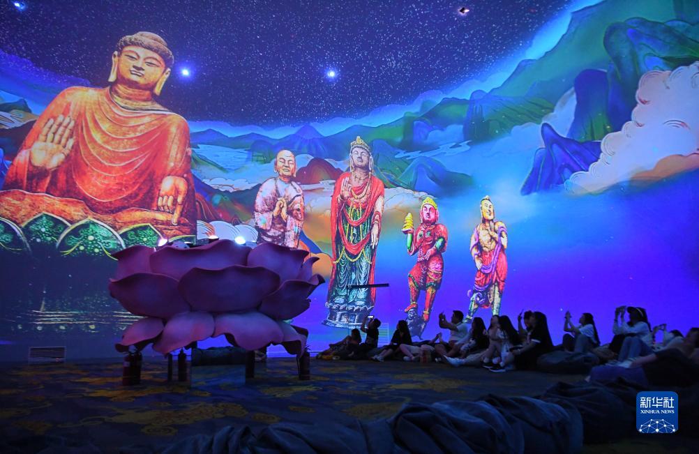 游客在河南洛陽(yáng)無(wú)上龍門(mén)沉浸式體驗館觀(guān)看影片(2023年6月6日攝)。洛陽(yáng)大遺址保護和遺址公園建設亮點(diǎn)突出,一批集空間游玩、非遺體驗、沉浸互動(dòng)等為一體的文化場(chǎng)景次第涌現,優(yōu)秀文創(chuàng )項目和產(chǎn)品破“圈”而出,讓年輕人心向往之。