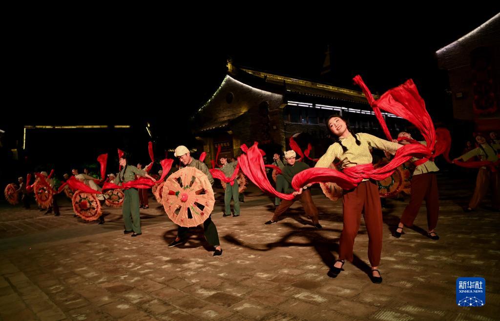 演員在陜西延安的金延安文化旅游產(chǎn)業(yè)園區表演紅色歌舞劇《延安十三年》(2023年8月31日攝)。大型紅色沉浸式歌舞劇《延安十三年》復原了上世紀三四十年代延安街景,選取當時(shí)典型人物和故事,通過(guò)技術(shù)創(chuàng )新手法和行進(jìn)式表演為觀(guān)眾帶來(lái)沉浸式的紅色文化體驗。