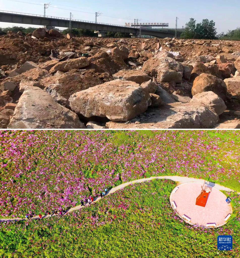 拼版照片:上圖為日照市東港區碳匯花海未整治前的畫(huà)面(資料照片);下圖為2023年10月25日拍攝的日照市東港區碳匯花海(無(wú)人機照片)。