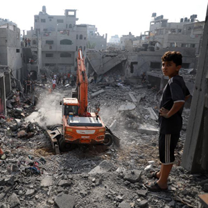 10月25日,在加沙地帶南部城市汗尤尼斯,挖掘機在以色列空襲后的建筑廢墟現場(chǎng)作業(yè)。