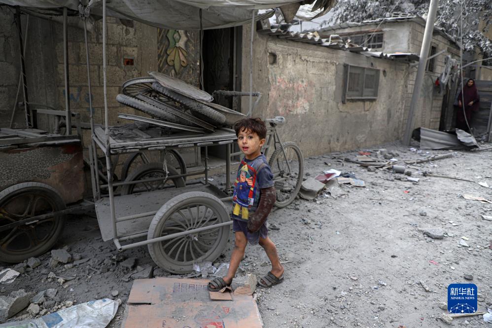 10月25日,在加沙地帶南部城市汗尤尼斯,一名男孩走在以色列空襲后的街道上。