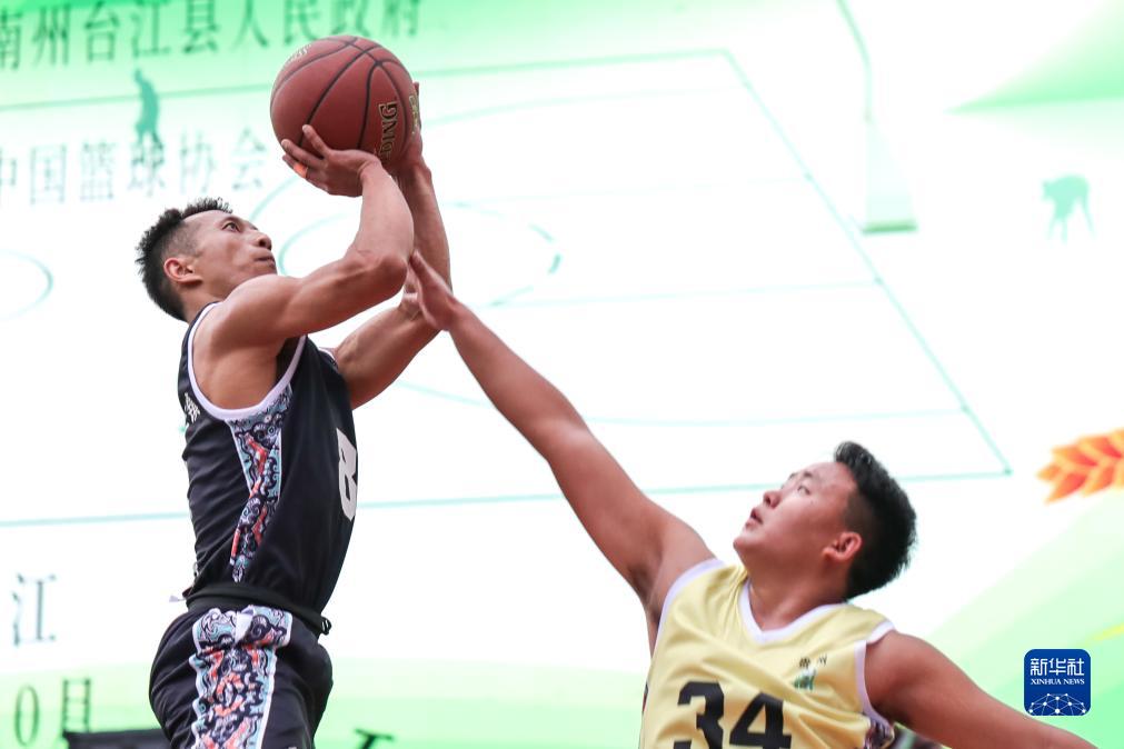 10月25日,山東省淄博市沂源縣悅莊鎮代表隊球員申守法(左)在貴州省黔東南州黎平縣尚重鎮代表隊球員潘遠波的防守下投籃。