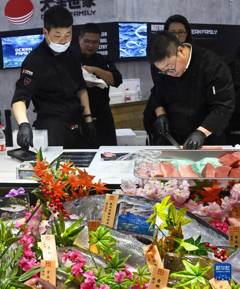 10月25日,參展企業(yè)在漁業(yè)博覽會(huì )上展示、加工水產(chǎn)品。