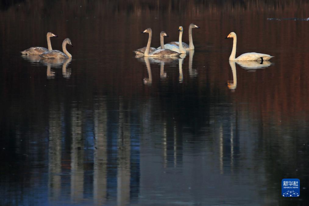 當日,在山東省榮成市天鵝湖,天鵝沐浴晨光,與湖光山色構成詩(shī)情畫(huà)意的美景。