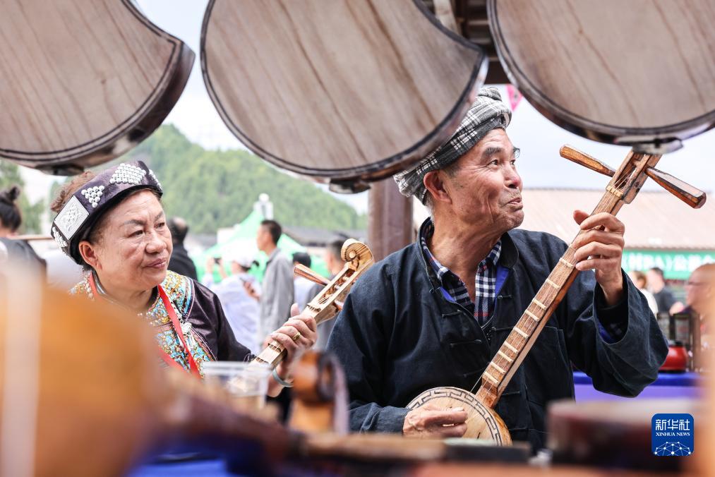 10月25日,布依族藝人在臺江縣球場(chǎng)旁搭建的非遺集市上演奏月琴。