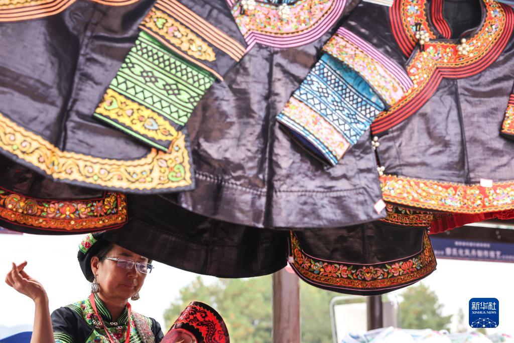 10月25日,當地群眾在臺江縣球場(chǎng)旁搭建的非遺集市上制作刺繡。