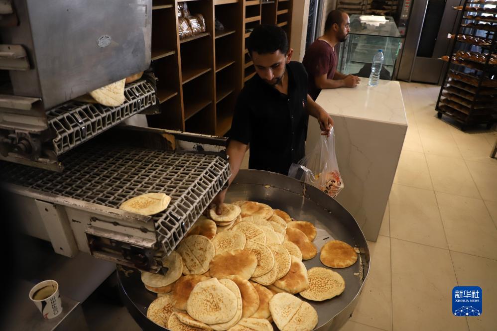 10月25日,在加沙地帶南部城市汗尤尼斯,工作人員在一家烘焙店內制作食品。