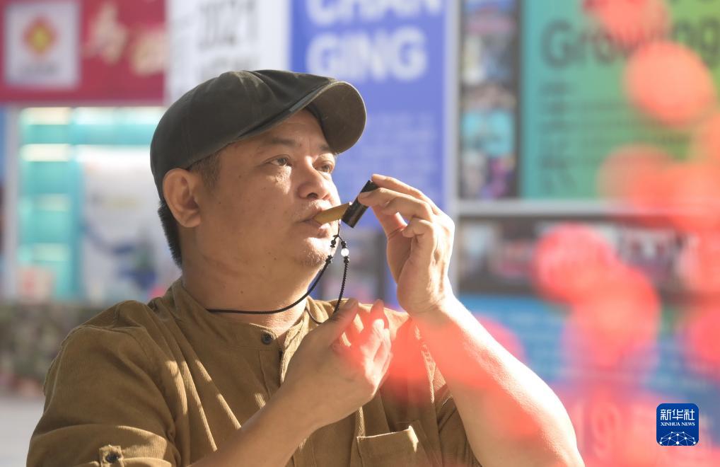 10月25日,黃守堃在演奏漆藝竹鳥(niǎo)笛。