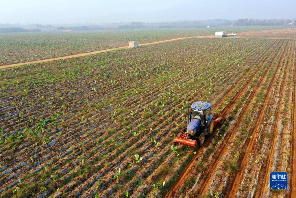 10月26日,農機在青島市即墨區金口鎮的田間收獲芋頭(無(wú)人機照片)。