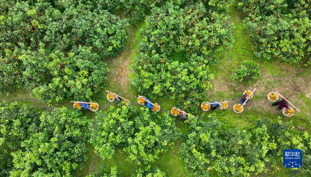 10月24日,四川省成都市雙流區永安鎮梨園村柑橘種植基地工作人員在裝運成熟的柑橘(無(wú)人機照片)。
