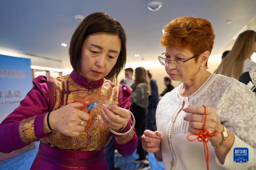 10月26日,在俄羅斯符拉迪沃斯托克,來(lái)自吉林省的手工藝人徐卉(左)向觀(guān)眾展示魚(yú)皮畫(huà)制作。