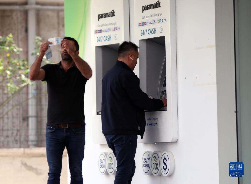 10月26日,在土耳首都其安卡拉,人們在一處銀行自動(dòng)柜員機前辦理業(yè)務(wù)。