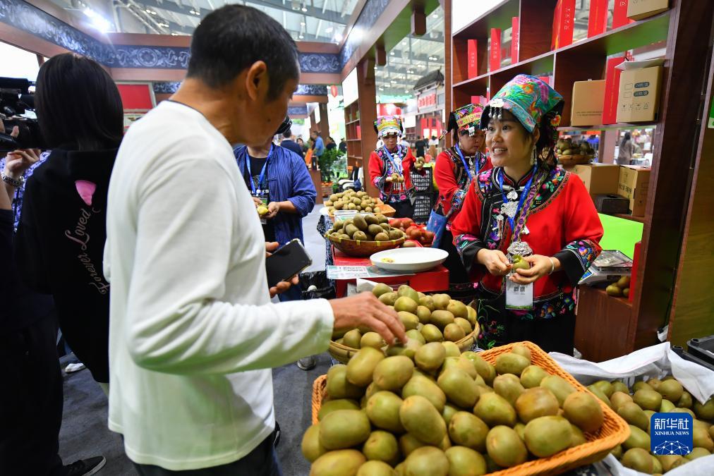 10月27日,在長(cháng)沙國際會(huì )展中心舉辦的農博會(huì )現場(chǎng),湘西蔬果展區的參展商向參觀(guān)者介紹獼猴桃。