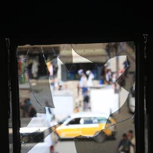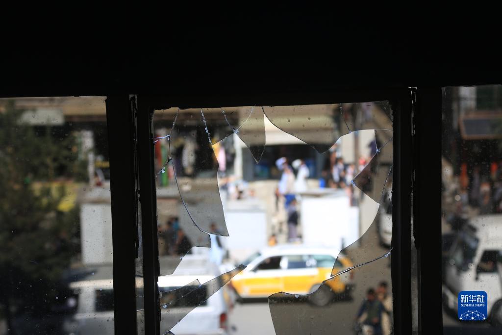 這是10月27日在阿富汗首都喀布爾拍攝的爆炸現場(chǎng)碎裂的玻璃。
