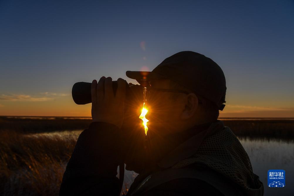 10月26日,中國野生動(dòng)物保護協(xié)會(huì )吉林白城護飛隊隊員王巖觀(guān)察候鳥(niǎo)棲息狀態(tài)。