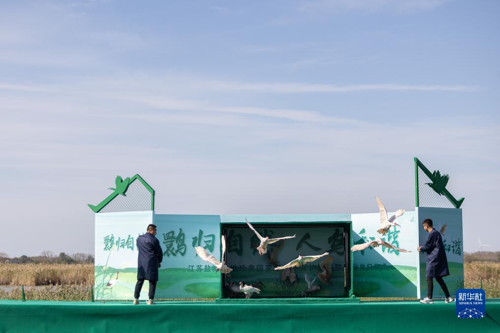 10月27日,在江蘇鹽城濕地珍禽國家級自然保護區,工作人員放飛朱鹮。