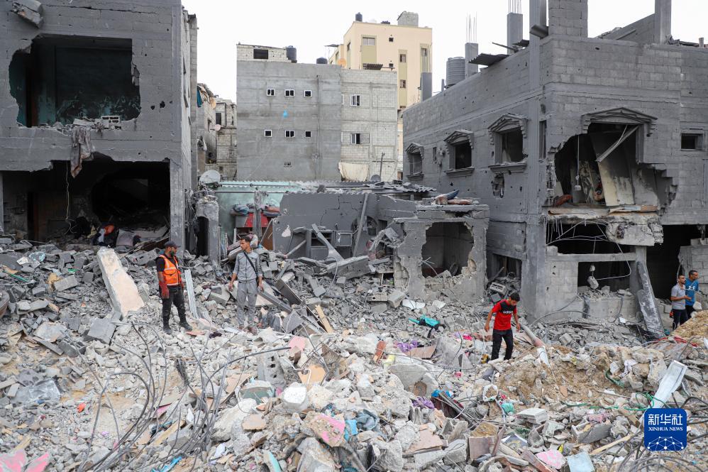 10月27日,在加沙地帶南部城市汗尤尼斯,人們查看建筑廢墟。