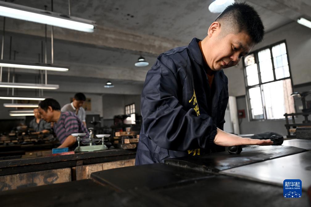 10月24日,在安徽省黃山市歙縣老胡開(kāi)文墨業(yè)有限公司,周健在揉搓墨條。