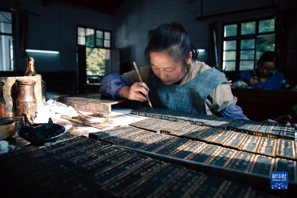 10月24日,在安徽省黃山市歙縣老胡開(kāi)文墨業(yè)有限公司,工人在描金車(chē)間為晾制好的墨描金。