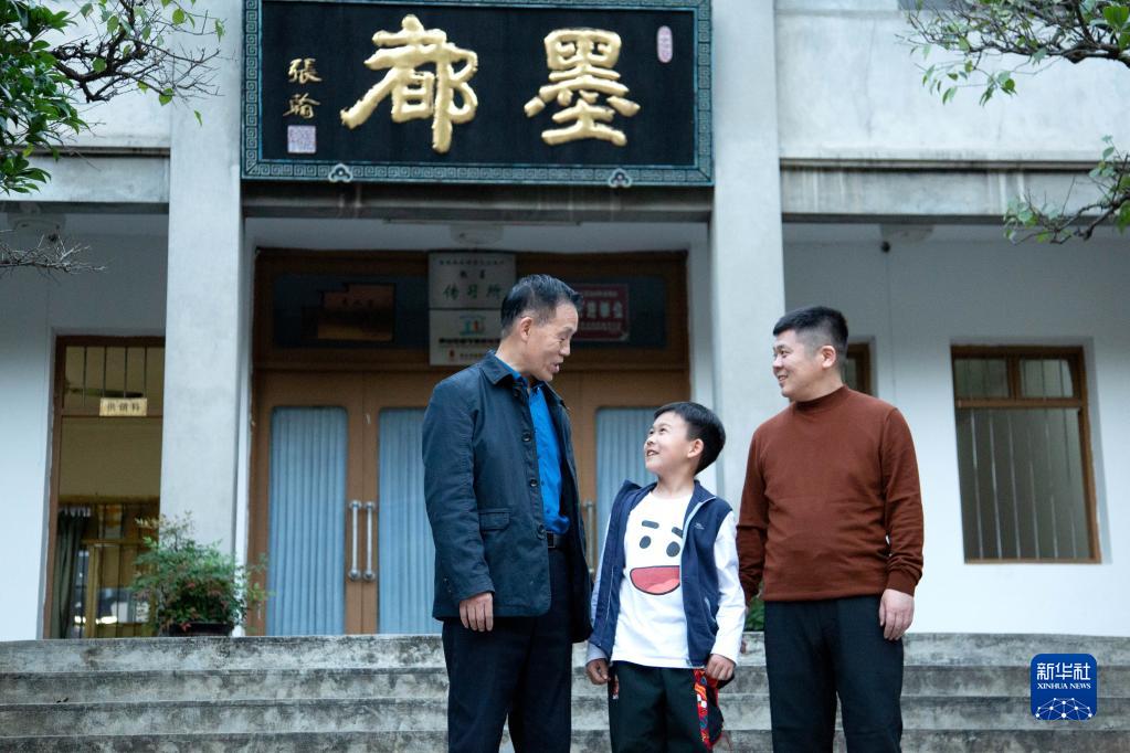 10月24日,在安徽省黃山市歙縣老胡開(kāi)文墨業(yè)有限公司,周美洪(左一)與兒子周?。ㄓ乙唬?、孫子周墨合影。