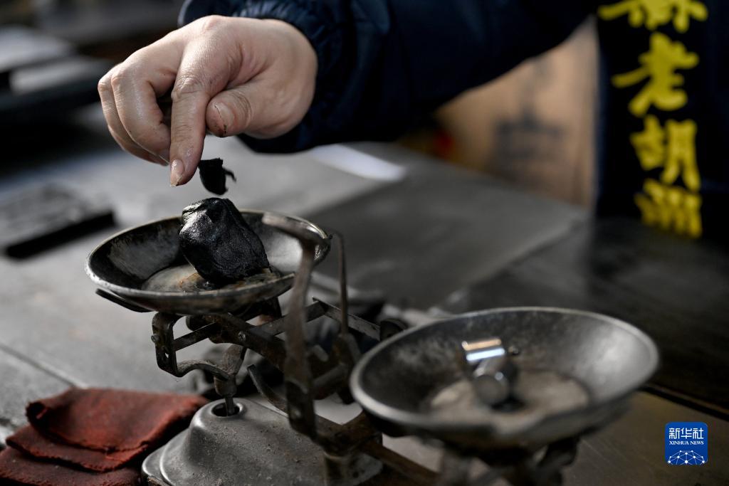 10月24日,在安徽省黃山市歙縣老胡開(kāi)文墨業(yè)有限公司,周健在稱(chēng)重墨塊。