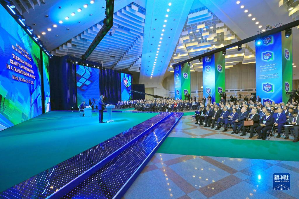 這是10月26日在白俄羅斯首都明斯克拍攝的“歐亞安全:轉型世界的現實(shí)與前景”高級別國際會(huì )議現場(chǎng)。