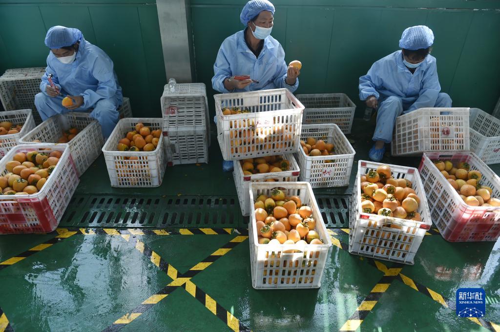 10月28日,村民在禹州市磨街鄉劉門(mén)村的加工廠(chǎng)里篩選柿子。
