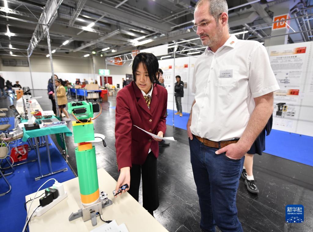 10月28日,在德國紐倫堡,一名北京市第八十中學(xué)的學(xué)生向參觀(guān)者介紹一款自穩定三腳架模型。