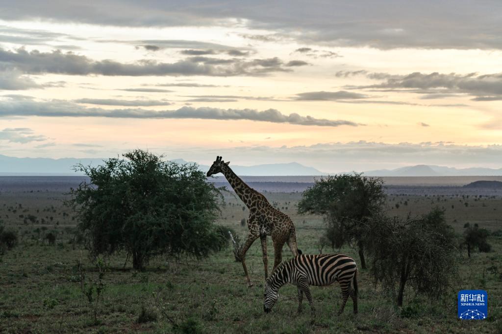 10月27日,長(cháng)頸鹿、斑馬在肯尼亞塔伊塔-塔韋塔郡泰塔山野生動(dòng)物保護區內活動(dòng)。