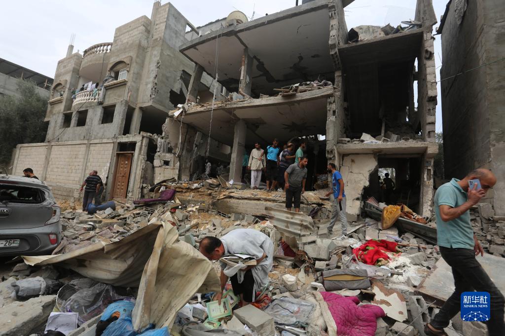 10月29日,在加沙地帶南部城市拉法,人們查看被以軍空襲損毀的建筑。