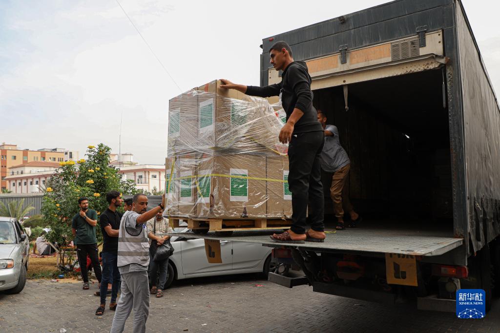 10月29日,工作人員在加沙地帶南部城市汗尤尼斯的一家醫院搬運醫療援助物資。