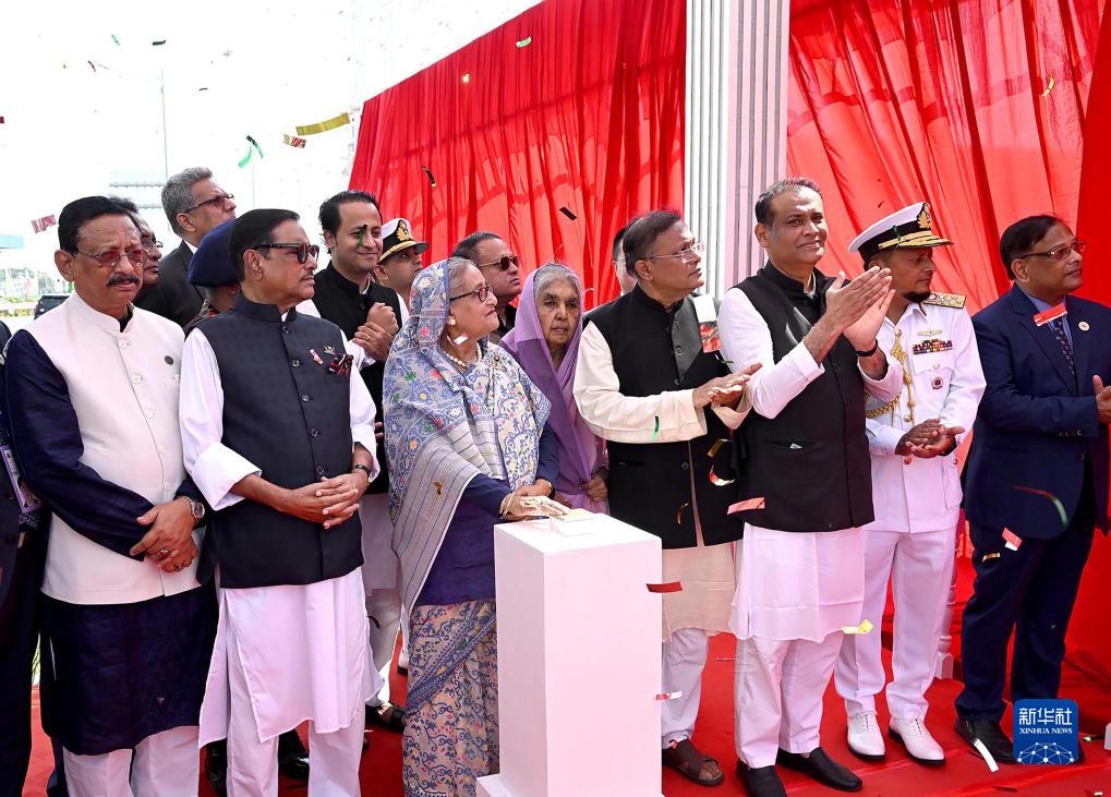 10月28日,在孟加拉國吉大港市,孟加拉國總理哈西娜(前排左三)出席卡納普里河底隧道通車(chē)儀式。