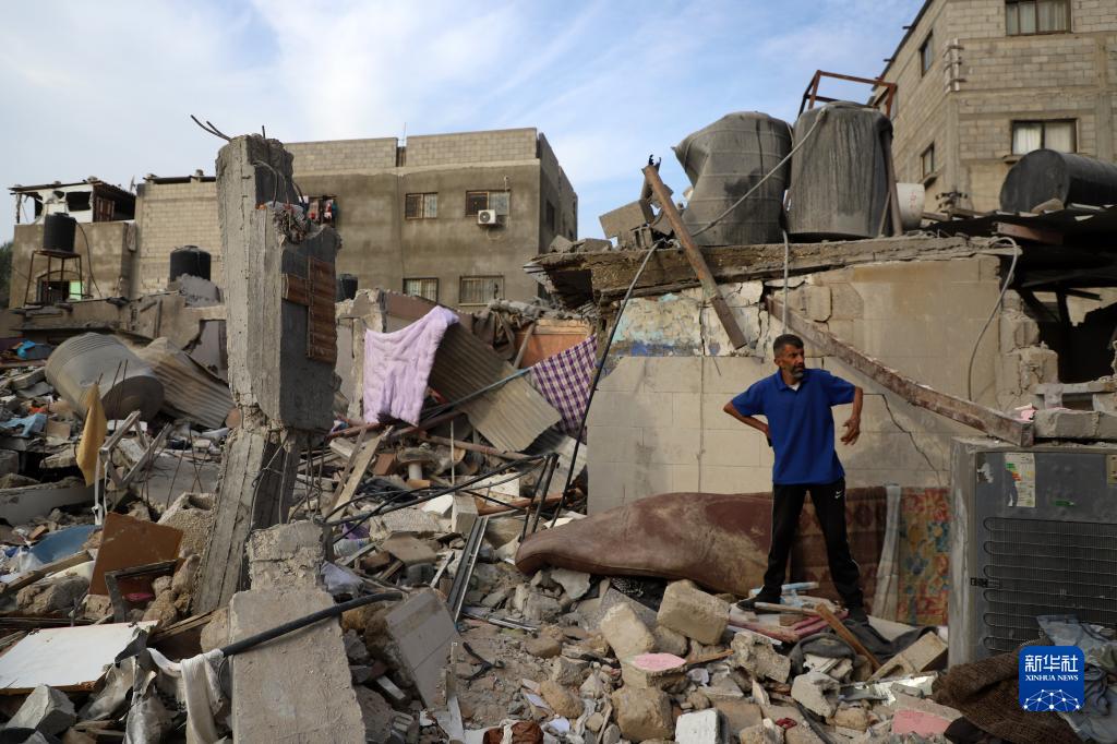 10月29日,在加沙地帶南部城市汗尤尼斯,一名男子站在遭以色列襲擊損毀的建筑中。