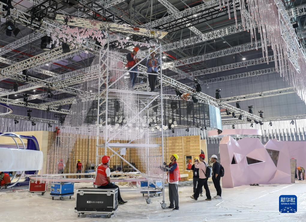 工作人員在國家會(huì )展中心(上海)內部布展施工(10月29日攝)。