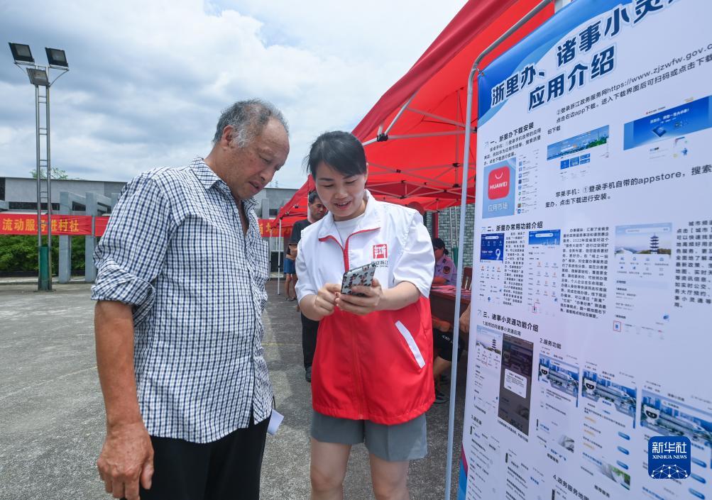 2023年7月3日,浙江省諸暨市店口鎮便民服務(wù)中心在上畈村開(kāi)展政務(wù)服務(wù)進(jìn)村入社“流動(dòng)服務(wù)”活動(dòng),村級代辦員在給村民講解“諸事小靈通”APP的使用方法。