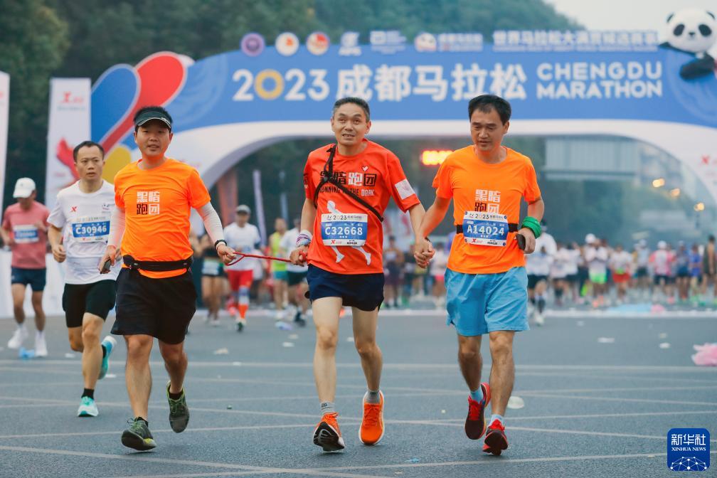 “黑暗跑團”陪跑志愿者覃銳(前左)、曾萬(wàn)軍(前右)陪伴視障跑者李中書(shū)參加2023成都馬拉松比賽(10月29日攝)。新華社記者 沈伯韓 攝