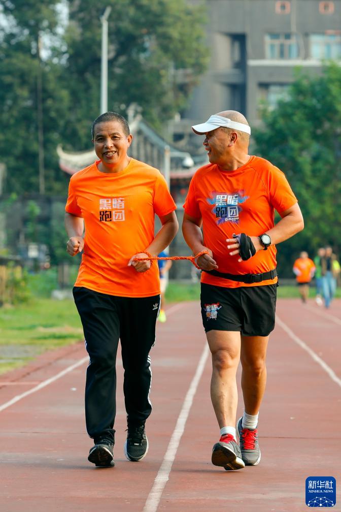 在四川大學(xué)華西校區運動(dòng)場(chǎng),“黑暗跑團”志愿者謝蜀賢(右)用陪跑繩帶著(zhù)視障跑者王克泉訓練(10月28日攝)。新華社記者 沈伯韓 攝
