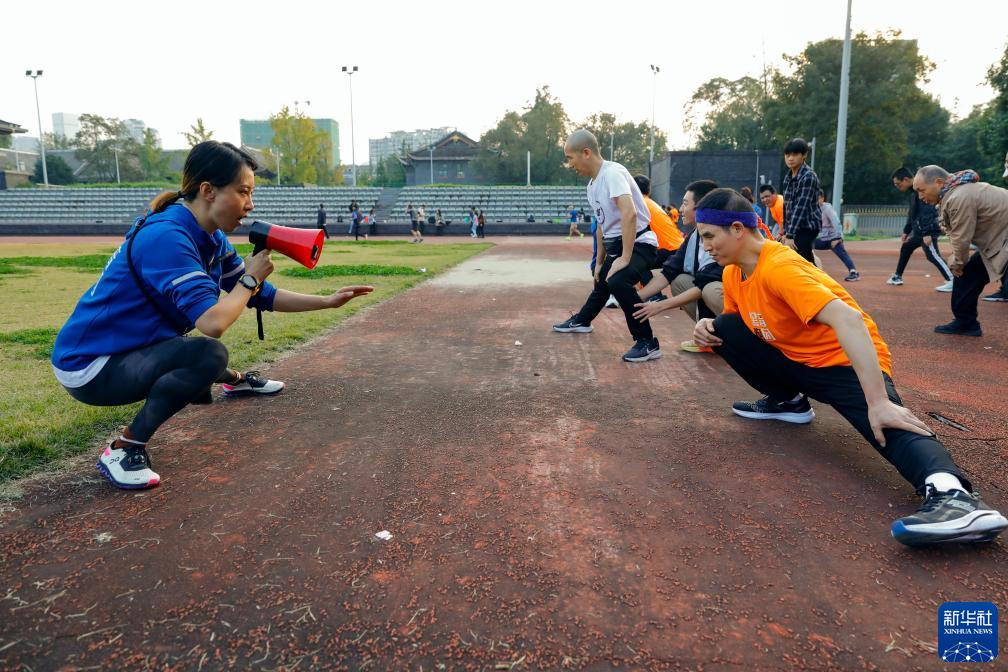 在四川大學(xué)華西校區運動(dòng)場(chǎng),“黑暗跑團”志愿者陳霞(左一)帶領(lǐng)視障跑者和陪跑志愿者在訓練前進(jìn)行熱身活動(dòng)(10月28日攝)。新華社記者 沈伯韓 攝