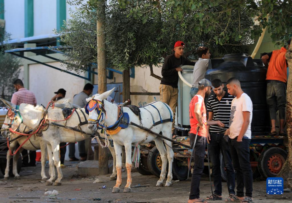 10月30日,因缺乏燃料,人們在加沙地帶南部城市汗尤尼斯使用畜力車(chē)運輸飲用水。