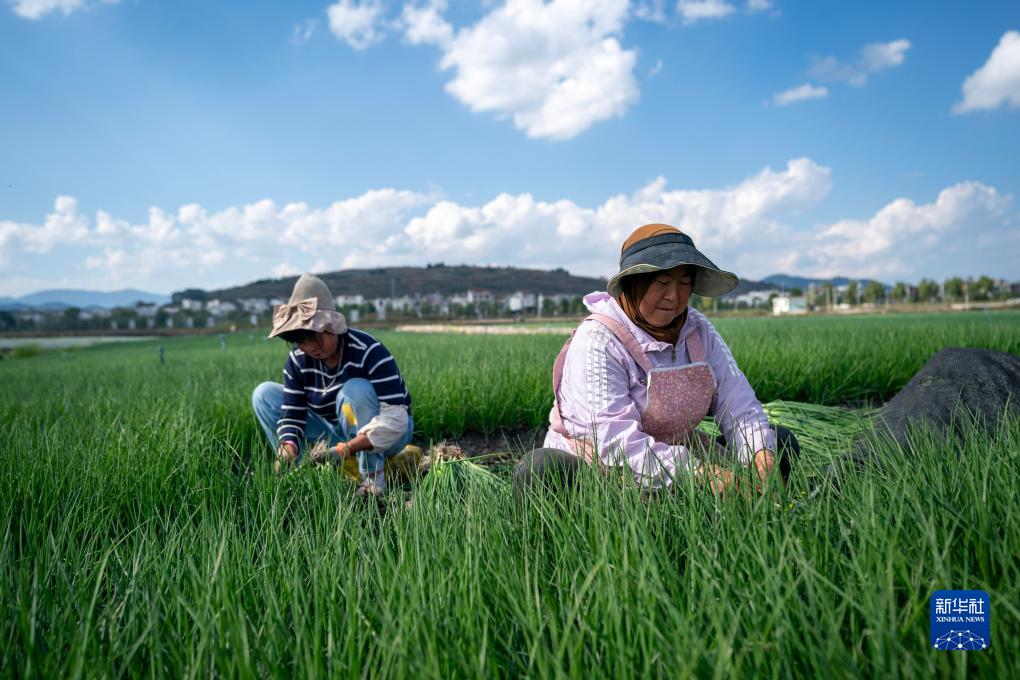 10月30日,農民在魯甸縣一處香蔥種植基地內采收香蔥。