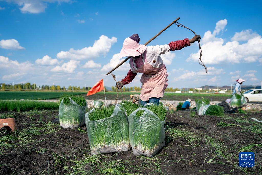 10月30日,農民在魯甸縣一處香蔥種植基地內準備運送香蔥。